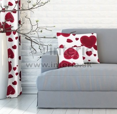 Obliečka na vankúšik z metrážné látky. Zapínanie je pomocou zipsového uzáveru. Vzor na vankúšiku sa môže líšiť od vyobrazeného. Farba látky je svetlá s výrazným moderným vzorom srdiečok.