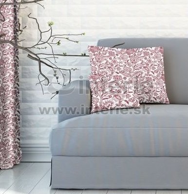 Obliečka na vankúšik z metrážné látky. Zapínanie je pomocou zipsového uzáveru. Vzor na vankúšiku sa môže líšiť od vyobrazeného. Farba látky je svetlá s červeno-vínovým vzorom.