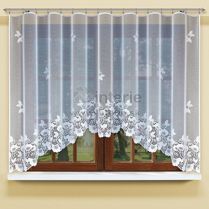 Ide o hotovú záclonu, zabalenú a pripravenú na odoslanie. Má pevné okraje a našitú riasiacu stužku. Záclona je ozdobená kvetinami. Uvedená výška záclony je meraná v najdlhšom mieste.