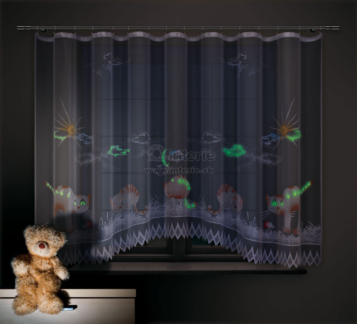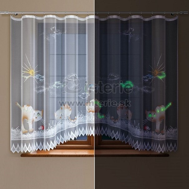 Biela kusová záclona Tina je ideálnym doplnkom do detskej izby. Záclona má fosforeskujúce prvky, ktoré v tme svietia.